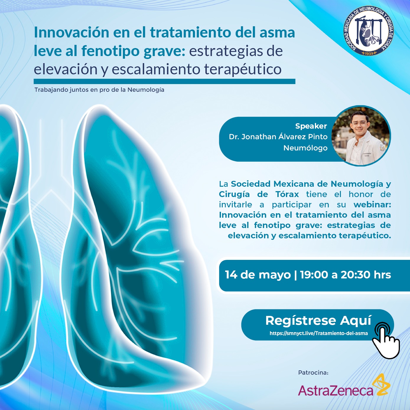 La Sociedad Mexicana de Neumología y Cirugía de Tórax te invita a participar en el webinar: Innovación en el tratamiento del asma leve al fenotipo grave: estrategias de elevación y escalamiento terapéutico, un espacio de actualización clínica enfocado en la toma de decisiones terapéuticas basadas en evidencia, identificación de fenotipos y optimización del manejo del asma en la práctica diaria.