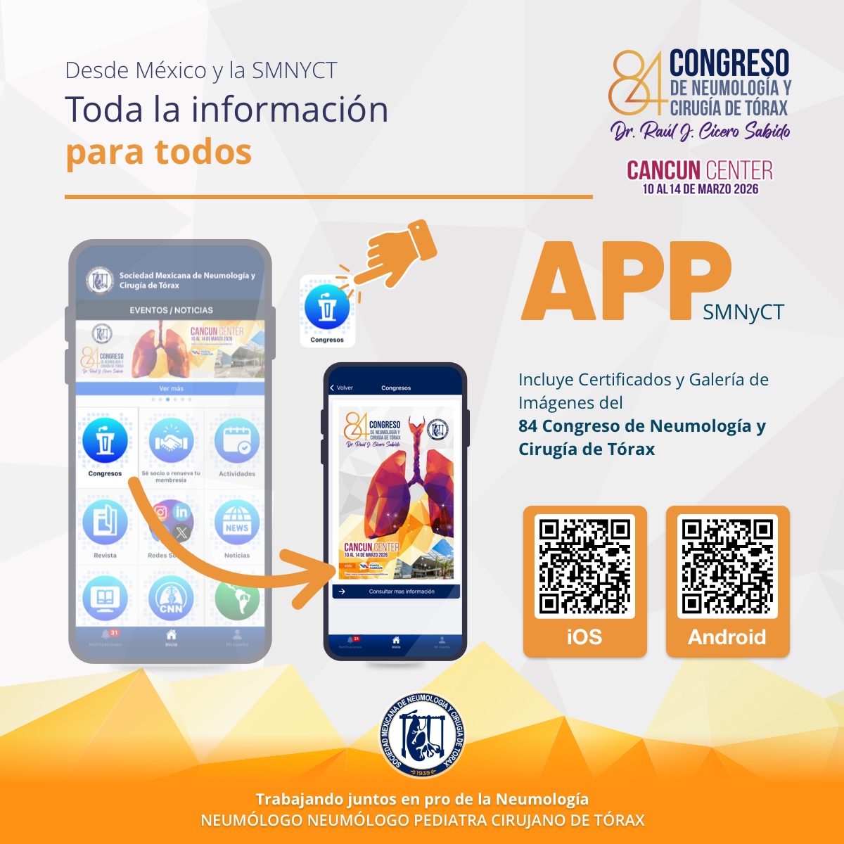 A través de la aplicación podrás estar más cerca de la SMNyCT, una comunidad conformada por líderes y expertos en medicina respiratoria mexicana, comprometida con la excelencia académica, el aprendizaje continuo, la colaboración profesional y el desarrollo de soluciones innovadoras en Neumología.